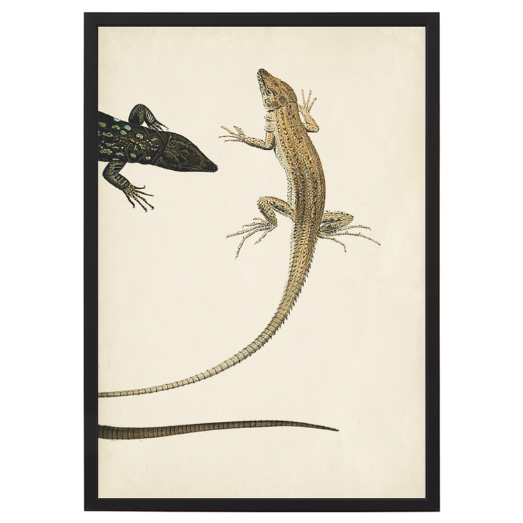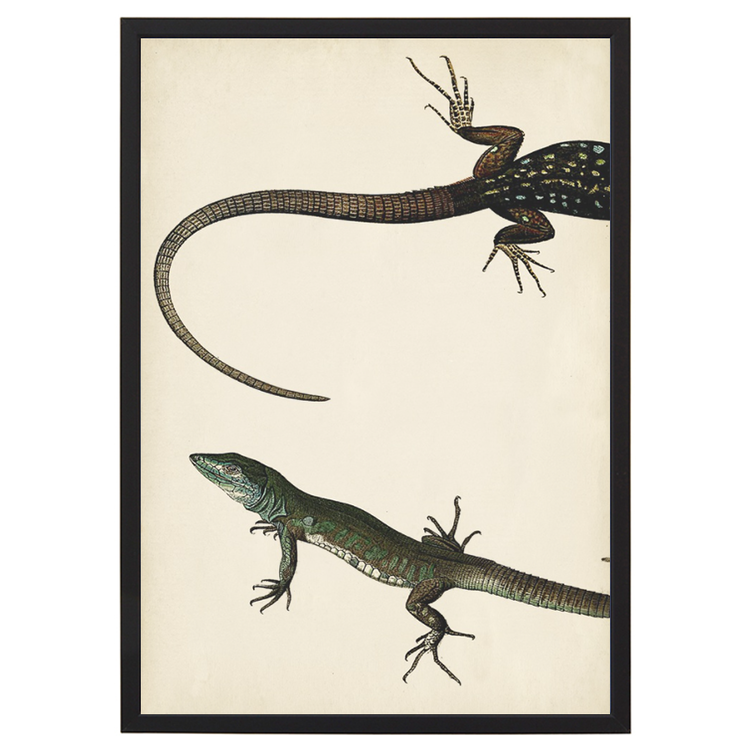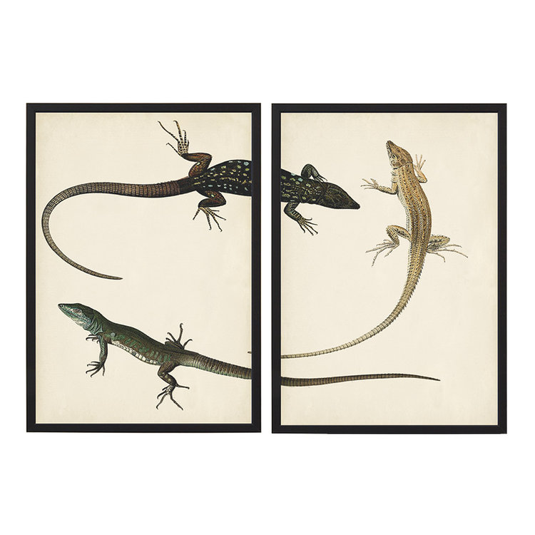 De twee werken zijn zo gemaakt dat deze precies naast elkaar passen en zo een groter geheel vormen. De hagedissen zijn heel figuratief vormgegeven. De werken worden geleverd in een aluminium Pro Line wissellijst in de kleur zwart in het formaat 30 x 40 cm. Deze strakke smalle lijst valt niet te veel op, zodat de print zo soepel mogelijk in elkaar overloop. De lijsten zijn voorzien van een ophangsysteem, dus het enige wat je nodig hebt is een haakje in de muur!