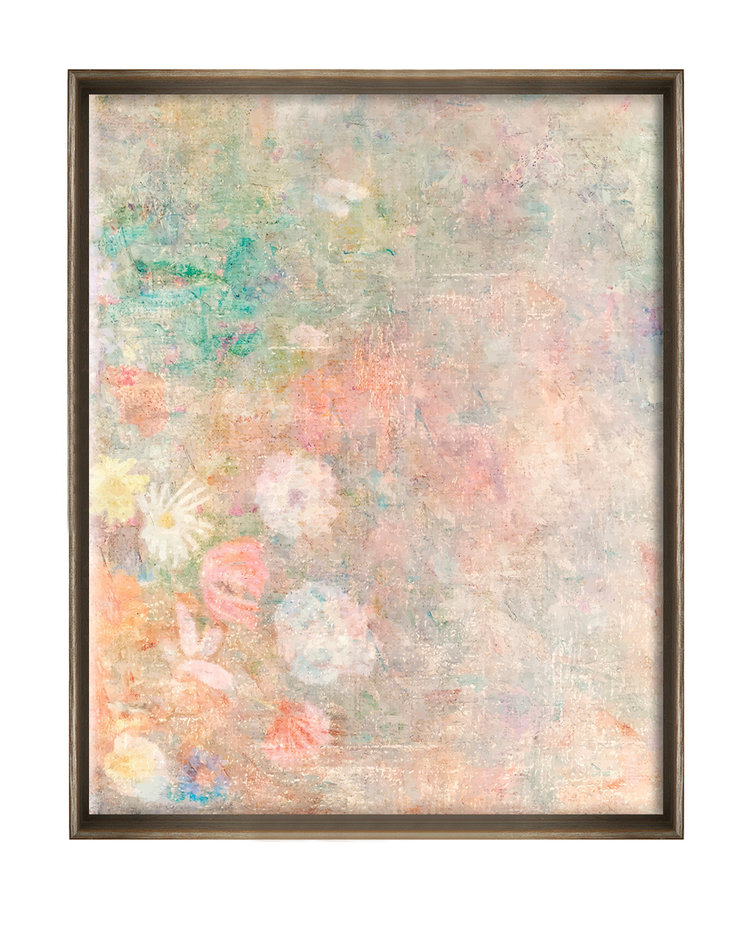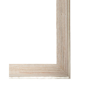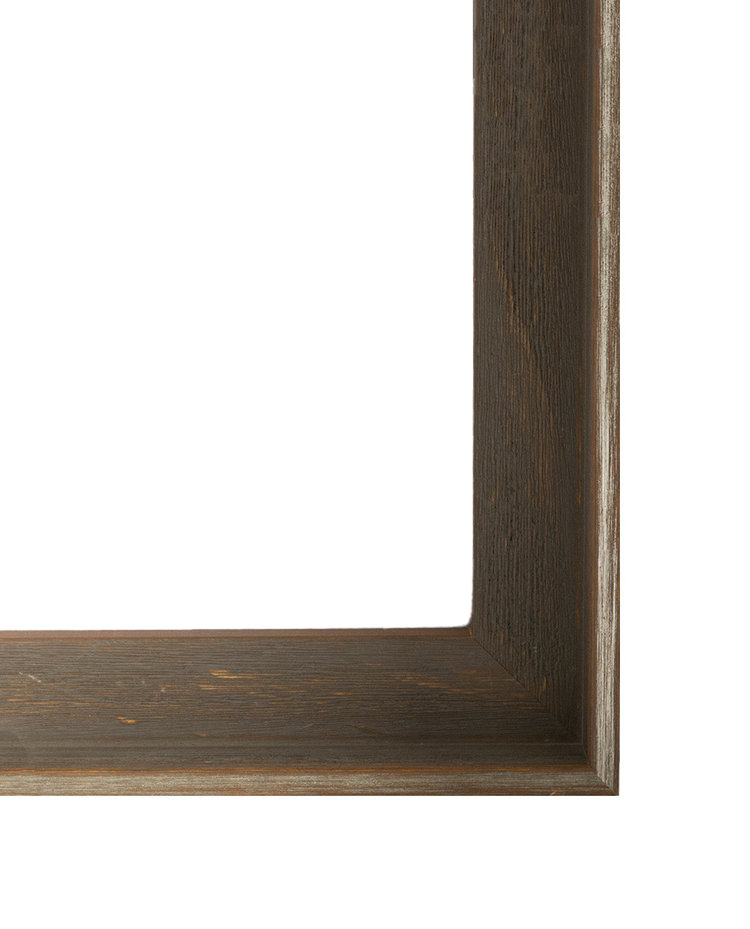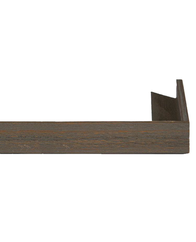 Deze lijst wordt speciaal als maatwerk, op de millimeter nauwkeurig, voor je samengesteld. We zijn fan van deze lijst, want het profiel is mooi smal, en de nerf en houtkleur zie je nog door het bruine heen. Het geborsteld zilveren en iets schuine randje trekt op een subtiele manier extra aandacht naar je kunstwerk.