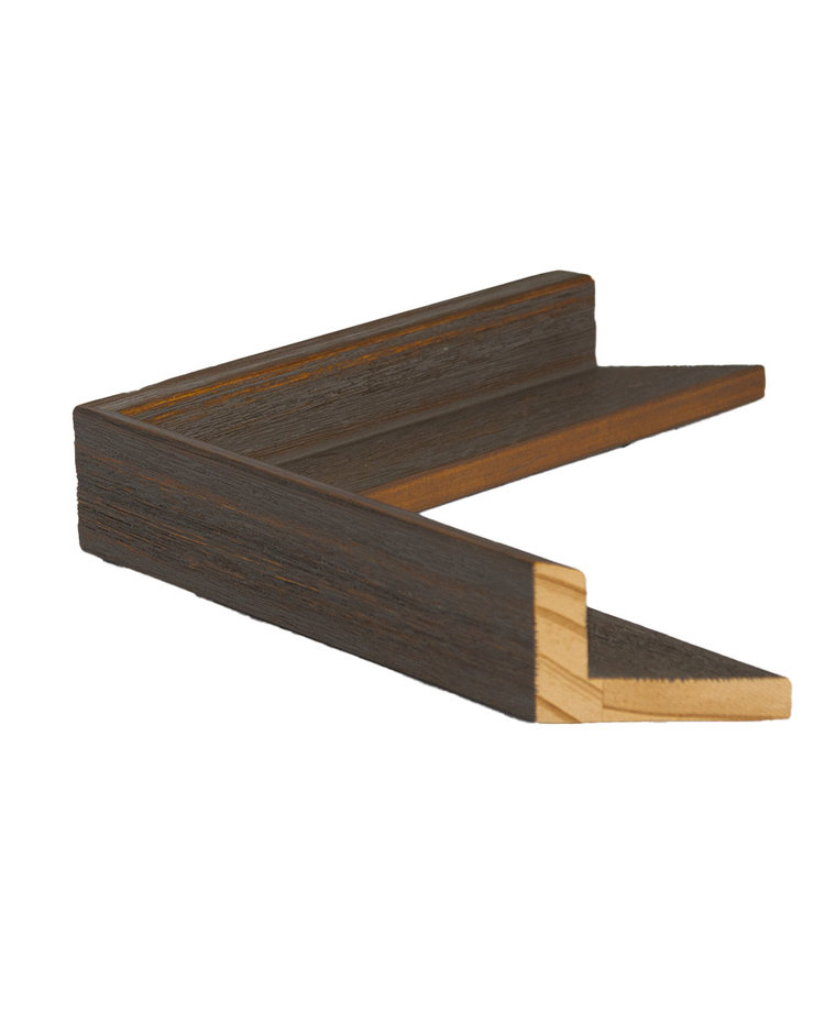 De kleur van deze lijst is bruin, doordat de lichte houtkleur er doorheen komt, is het geen diep bruine kleur, het neigt naar leverkleurig. De lijst past goed bij werken met zachte kleuren. De andere profielen in deze lijn zijn wit of zwart met geborsteld zilver.