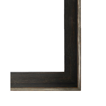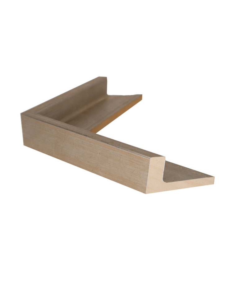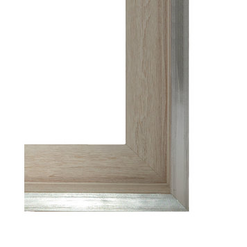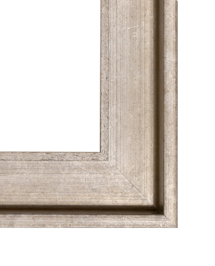 Deze lijst wordt speciaal als maatwerk, op de millimeter nauwkeurig, voor je samengesteld. We zijn fan van deze lijst, want het profiel is mooi smal, en de nerf en houtkleur zie je nog door het wit heen. Het geborsteld zilveren en iets schuine randje trekt op een subtiele manier extra aandacht naar je kunstwerk.