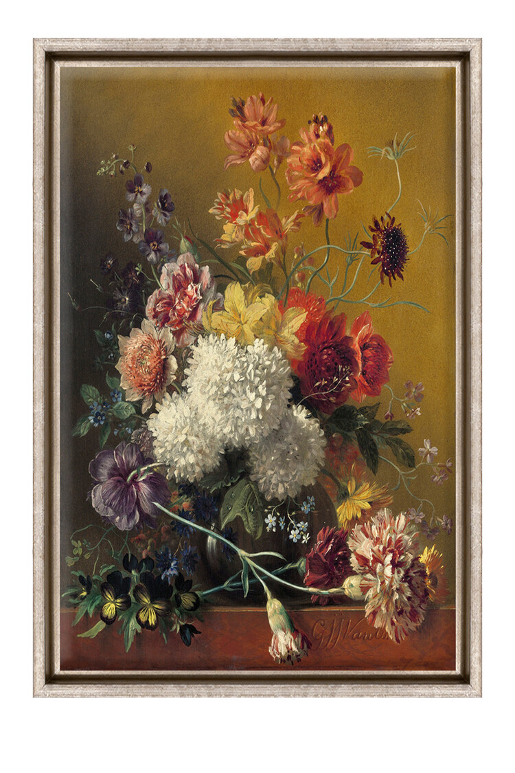 De baklijst is zilver en heeft licht koperen lijntjes, wat voor een klassieke uitstraling zorgt. De lijst past goed bij werken met zachte kleuren.