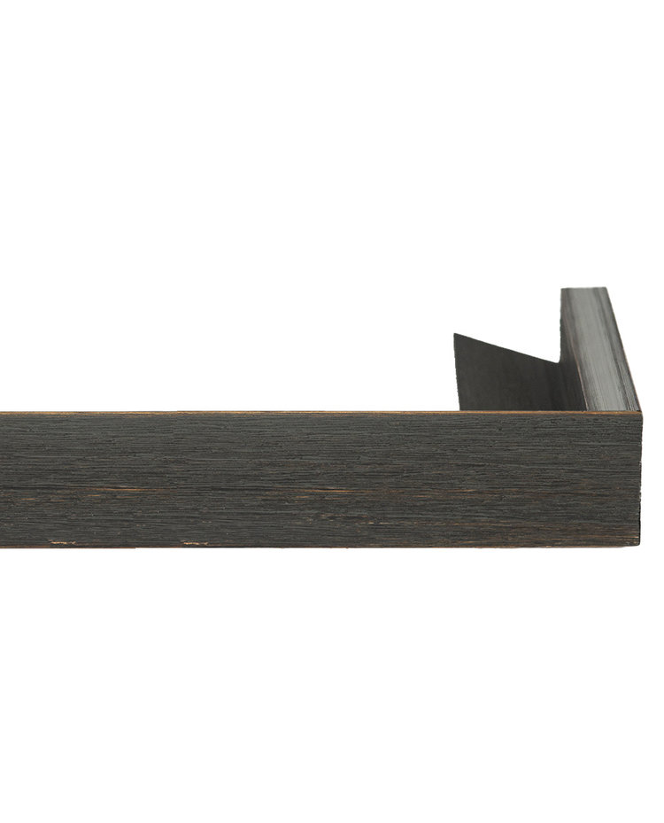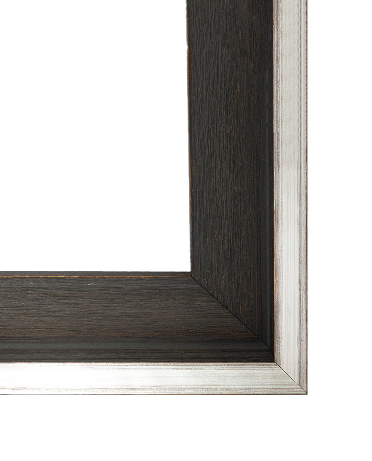 Deze lijst wordt speciaal als maatwerk, op de millimeter nauwkeurig, voor je samengesteld. We zijn fan van deze lijst. Door de zwarte wassing komt de houtkleur en nerf nog tevoorschijn waardoor deze lijst iets bruin lijkt. De geborsteld zilveren en iets schuine rand trekt extra aandacht naar je kunstwerk.