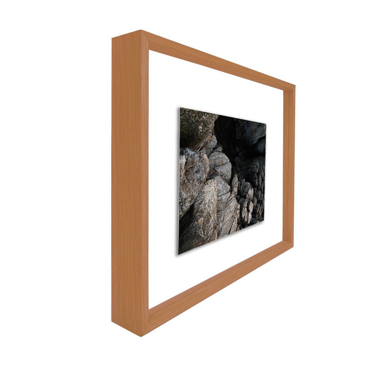 Optioneel kun je kiezen voor de uitvoering met een 8 mm hoge spacer. Deze spacer is in dezelfde kleur beuken fineer folie en zorgt ervoor dat je werk 8 mm van het glas vrij komt. Of je kunt een 3D werk met een dikte tot 7 mm achter het glas plaatsen zonder dat het glas geraakt wordt.