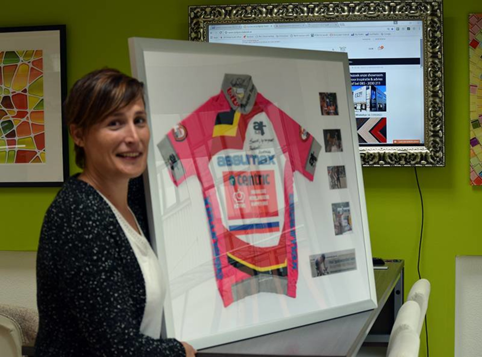 Haar soigneur, Sanne Fictoor, kreeg van Annemiek als dank voor haar ondersteuning een gesigneerde koerstrui. Deze hangt nu mooi ingelijst in haar sportmassagepraktijk SanneSportief in Wijk bij Duurstede. We wensen Sanne er heel veel kijkplezier bij!