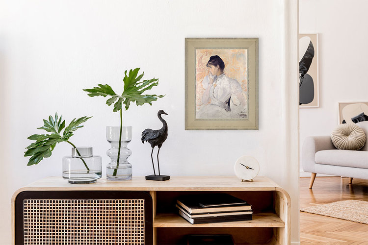 Een lijst met een afwerking in de kleur roomwit - crème. De binnenrand geeft door de subtiele ornamenten een robuust uiterlijk aan deze lijst. Vooral kunstwerken met subtiele kleuren komen goed uit in deze lijst. De lijst past perfect in een vintage landelijke stijl.