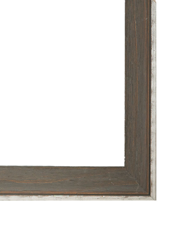 Een houten lijst met een bruine kleur en een geborstelde zilveren rand van het type DLF158 met een vintage uitstraling door de geborstelde zilveren kleur.