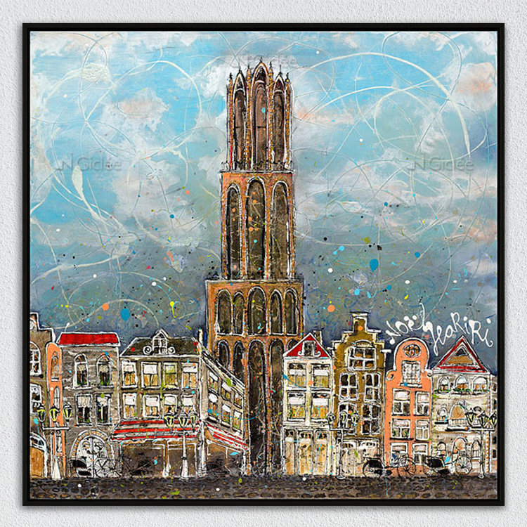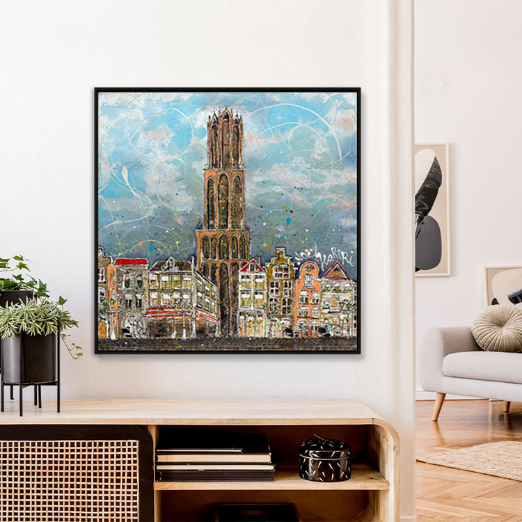 Dom Toren van Noël Hariri als Gicleé op canvas in een zwarte Premium Line baklijst. Inclusief kabelset om de baklijst op te kunnen hangen. Het lijst formaat is 100 x 100 cm (buitenmaat circa 103 x 103 cm) kan hangend gebruikt worden. De Gicleé is opgespannen op een houten spierraam en deze is in de lijst gemonteerd met schroefjes. Een erg leuk cadeau om te geven maar ook om zelf te ontvangen!