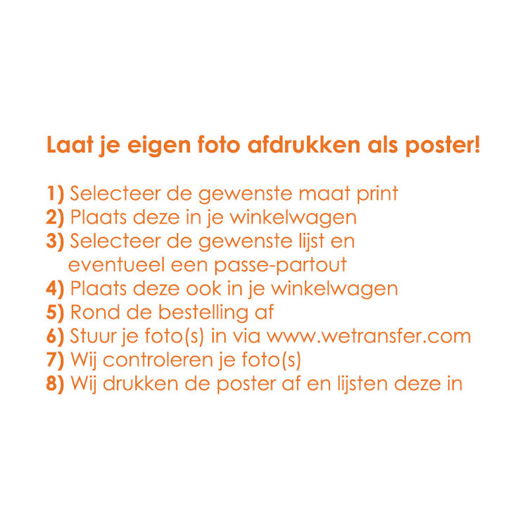 Bestel nu extra voordelig een poster bij je wissellijst. Al onze Premium posters worden standaard geprint op zeer luxe 220 (!) grams art paper. Je foto wordt full colour digitaal (of desgewenst zwart wit) in een zeer hoge kwaliteit geprint.