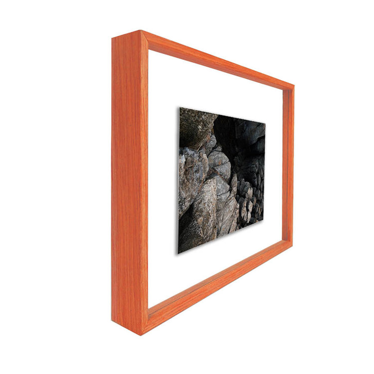 Optioneel kun je kiezen voor de uitvoering met een 8 mm hoge spacer. Deze spacer is in dezelfde kleur oranje fineer folie en zorgt ervoor dat je werk 8 mm van het glas vrij komt. Of je kunt een 3D werk met een dikte tot 7 mm achter het glas plaatsen zonder dat het glas geraakt wordt.