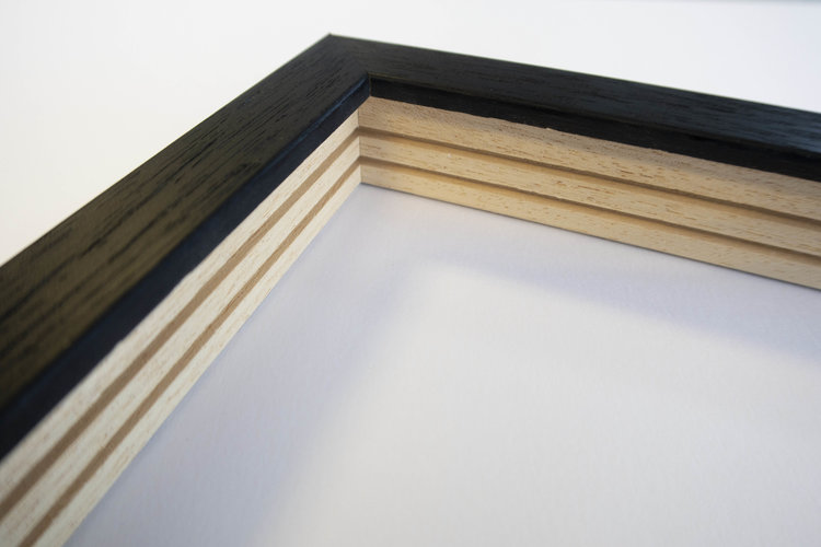 Ben je op zoek naar een lijst waarbij je 10 mm diepte achter het glas kunt creëren voor het zwevend inlijsten van bijvoorbeeld een opgeplakte plaat of een werk op geschept papier met fraai afgewerkte randen? Dan is onze Premium Box Line een passende zwart houten lijst waarmee je door de optioneel spacer een diepte van 10 mm achter het glas kunt creëren.