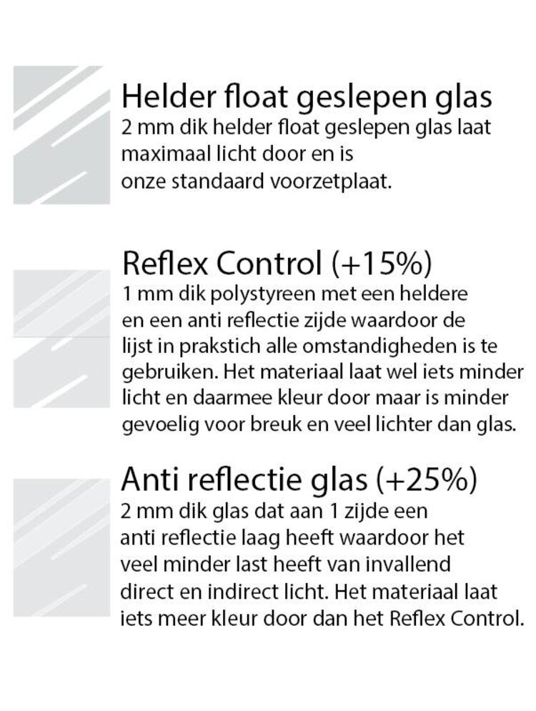 De hoogglans antracieten uitvoering staat goed op alle achtergronden, van licht tot donker. Al onze wissellijsten kunnen worden geleverd met tweezijdig bruikbaar 1 mm dik polystyreen. Hierdoor heeft uw wissellijst 2 gezichten, 1 met een heldere zijde en wanneer u de plaat omdraait een anti reflectie zijde. Zo weet u zeker dat ongeacht de licht ingeval uw lijst altijd goed is!