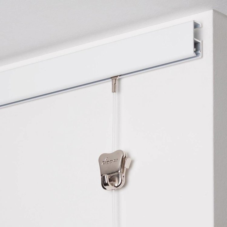 De Lijsten Fabriek levert voor de STAS cliprail (ook Pro en Max) systeem alsmede het STAS Multirail systeem de stijlvolle ZIPPER ophanghaak. Deze is volledig verstelbaar over het transparante Peron koord met een lengte van 150 cm. De ZIPPER op het perlonkoord kan tot maximaal 15 kg belast worden.