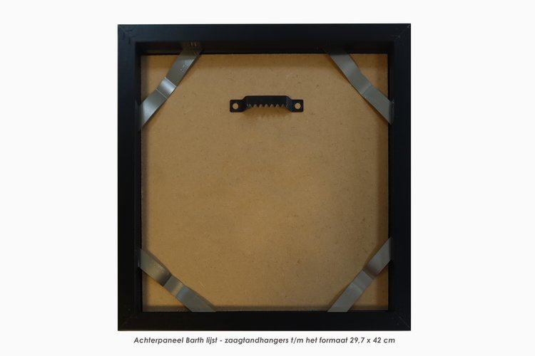 Tot en met formaat 29,7 x 42 cm zijn de lijsten voorzien van 2 zaagtandhangers. Daarboven zijn de achterpanelen voorzien van de vierpuntskabelset.