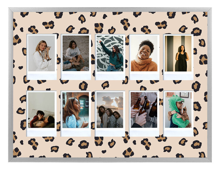 Instax aluminium Pro Line small zwarte of zilveren wissellijst in het formaat 28 x 35 cm voorzien van helder glas en een Panther achtergrond voor het inlijsten van 10 instax mini foto's.