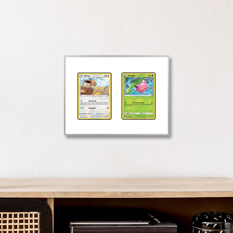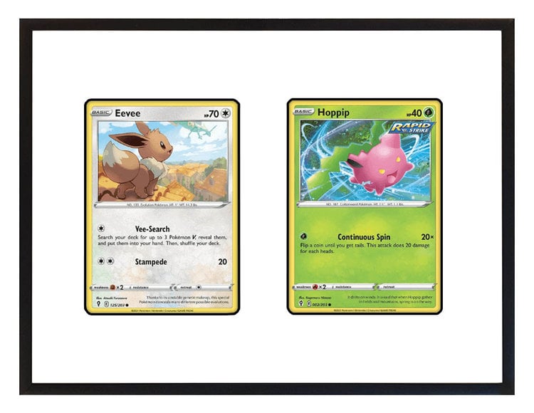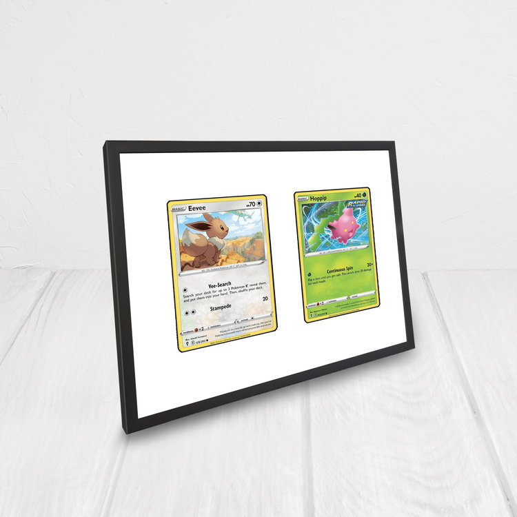 De witte achtergrond is een 1 mm forex plaat waar 2 uitsneden in is gemaakt waarin de Pokémon kaart precies past. Wanneer je de lijst ontvangt kun je de Pokémonkaarten gemakkelijk en snel inlijsten, de kaarten passen namelijk precies in de uitsnede en hoeven niet verlijmd of met tape vastgeplakt te worden. Je kunt de Pokémon kaarten dan ook desgewenst gemakkelijk wisselen.