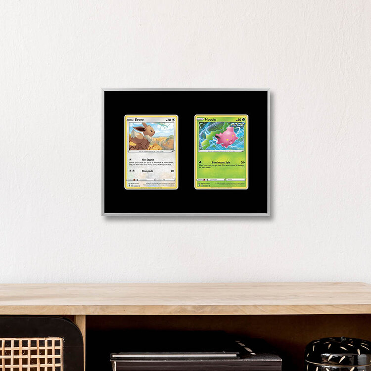 De zwarte achtergrond is een 1 mm forex plaat waar 2 uitsneden in is gemaakt waarin de Pokémon kaart precies past. Wanneer je de lijst ontvangt kun je de Pokémonkaarten gemakkelijk en snel inlijsten, de kaarten passen namelijk precies in de uitsnede en hoeven niet verlijmd of met tape vastgeplakt te worden. Je kunt de Pokémon kaarten dan ook desgewenst gemakkelijk wisselen.